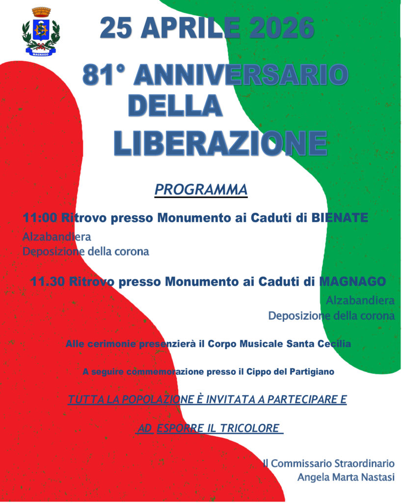 Home Eventi In Evidenza Notizie 25 Aprile 2026 – 81° Anniversario della Liberazione 25 Aprile 2026 – 81° Anniversario della Liberazione Mancano 4 giorni all'evento, inizio previsto sabato 25 aprile 2026. Condividi: Condividi su Facebook (Si apre in una nuova finestra) Facebook Condividi su X (Si apre in una nuova finestra) X Altro Invia un link a un amico via e-mail (Si apre in una nuova finestra) E-mail Condividi su LinkedIn (Si apre in una nuova finestra) LinkedIn Condividi su Telegram (Si apre in una nuova finestra) Telegram Condividi su WhatsApp (Si apre in una nuova finestra) WhatsApp Dettagli Date: sabato 25 aprile 2026 Orario: Dalle 11:00 alle 12:00 gCalendar Categorie Eventi In Evidenza Notizie