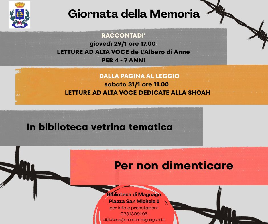 In occasione della Giornata della Memoria, la biblioteca comunale propone una vetrina di lettura per adulti e ragazzi sul tema della Shoah, per non dimenticare gli orrori del passato, riflettere, vigilare per tentare di evitare il ripetersi di eventi tragici