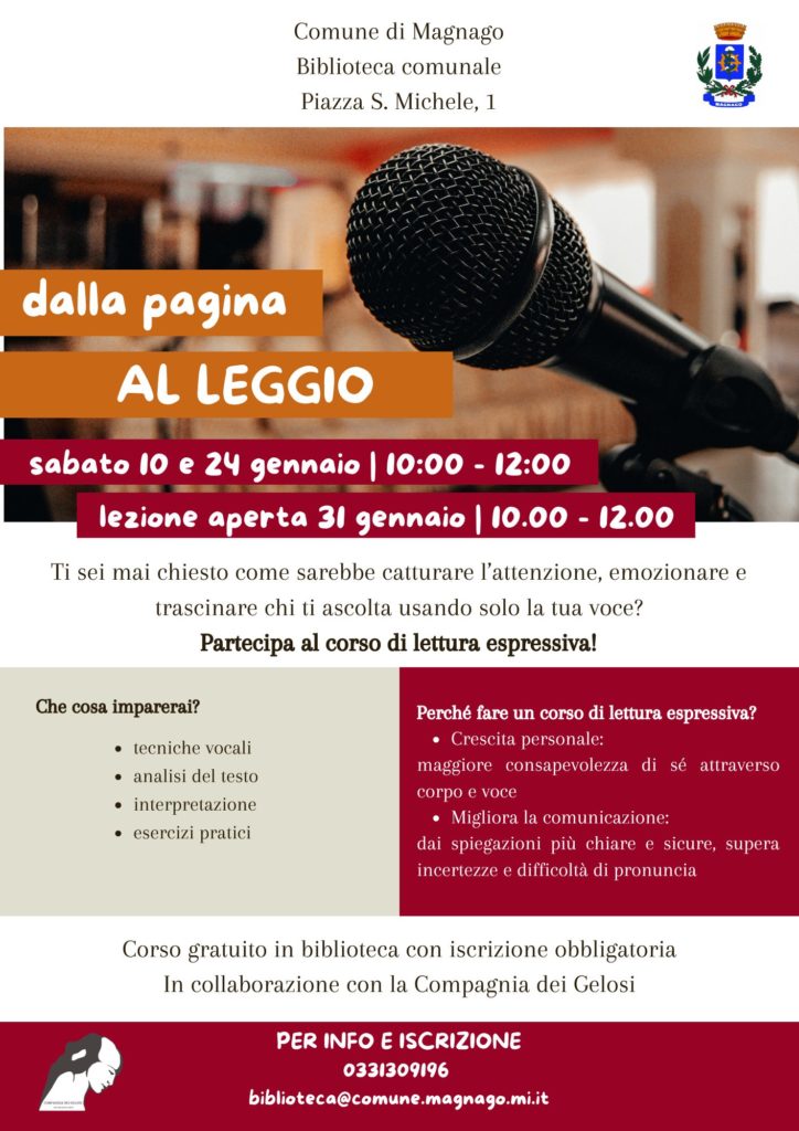 La biblioteca comunale propone un corso di lettura espressiva, gratuito e aperto a tutti, che si svolgerà al sabato mattina nei giorni 10 e 24 gennaio, con iscrizione obbligatoria chiamando il numero 0331309196 oppure scrivendo all’indirizzo mail biblioteca@comune.magnago.mi.it