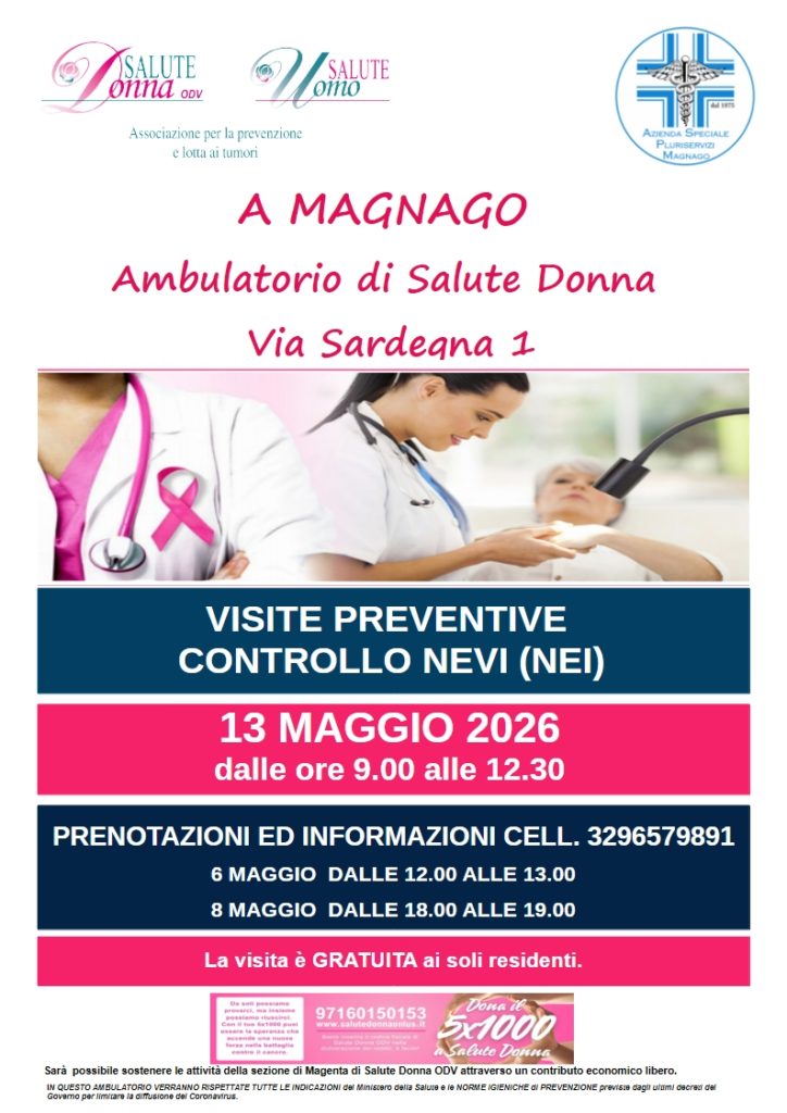 Mercoledì 13 maggio dalle ore 9.00 alle ore 12.30 presso l’ambulatorio di via Sardegna 1, si svolgeranno le visite preventive per il controllo nei.