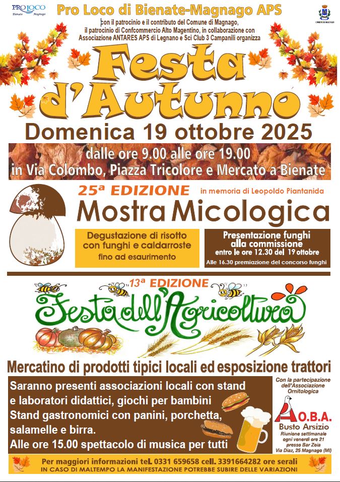 La Pro Loco di Bienate-Magnago con il patrocinio e contributo del Comune di Magnago, il patrocinio di Confcommercio Alto Magentino, organizza la Festa d’Autunno.