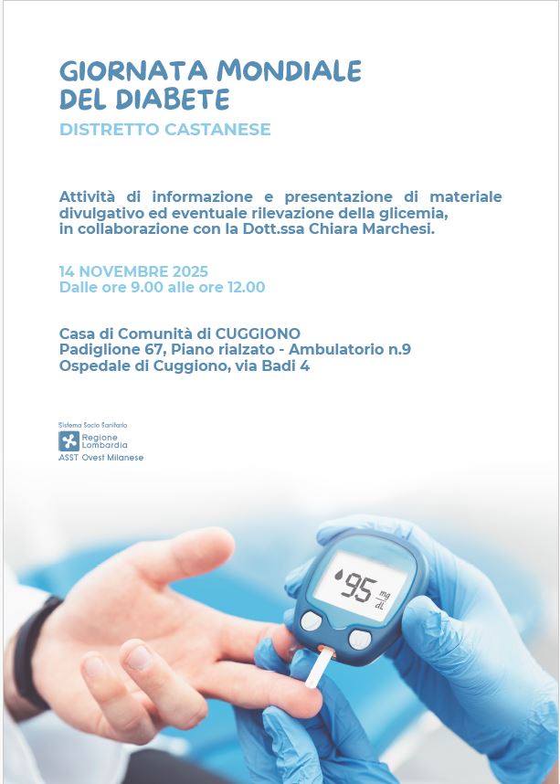 In occasione della Giornata Mondiale del Diabete, il Distretto Castanese ha programmato attività di presentazione, informazione con materiale divulgativo ed eventuale prova della glicemia su richiesta.