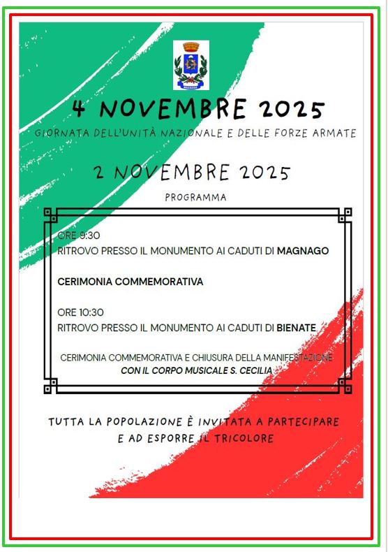 Le cerimonie si svolgeranno domenica 2 novembre 2025 a partire dalle ore 9:30 con ritrovo presso Monumento ai Caduti di Magnago e a seguire alle ore 10.30 presso Monumento ai Caduti di Bienate.