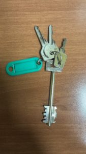 Descrizione dell’oggetto: un mazzo di chiavi così composto: una chiave per porta blindata con copertura in plastica nera; una chiave dal profilo tondo con copertura in plastica blu; una chiave dal profilo tondo; una chiave dal profilo quadrato con copertura in plastica nera; una chiave dal profilo quadrato. Il tutto legato ad un anello metallico